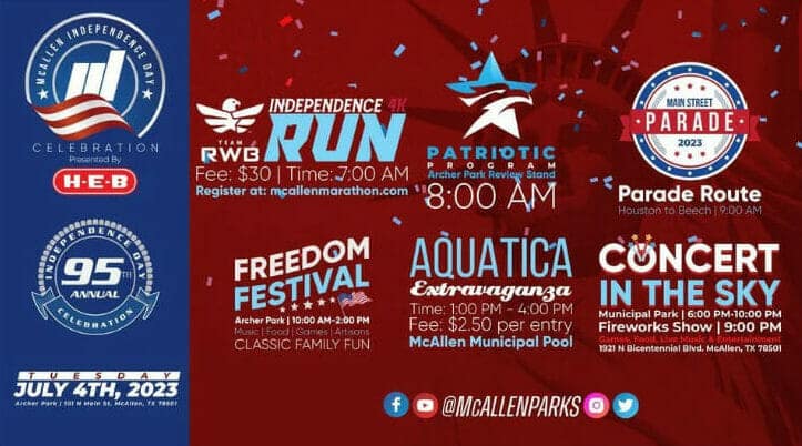 Featured McAllen Independence Day Celebration McAllen Municipal Park 1921 N Bicentennial BLVD, McAllen July 4, 2023 Event Details Get Directions